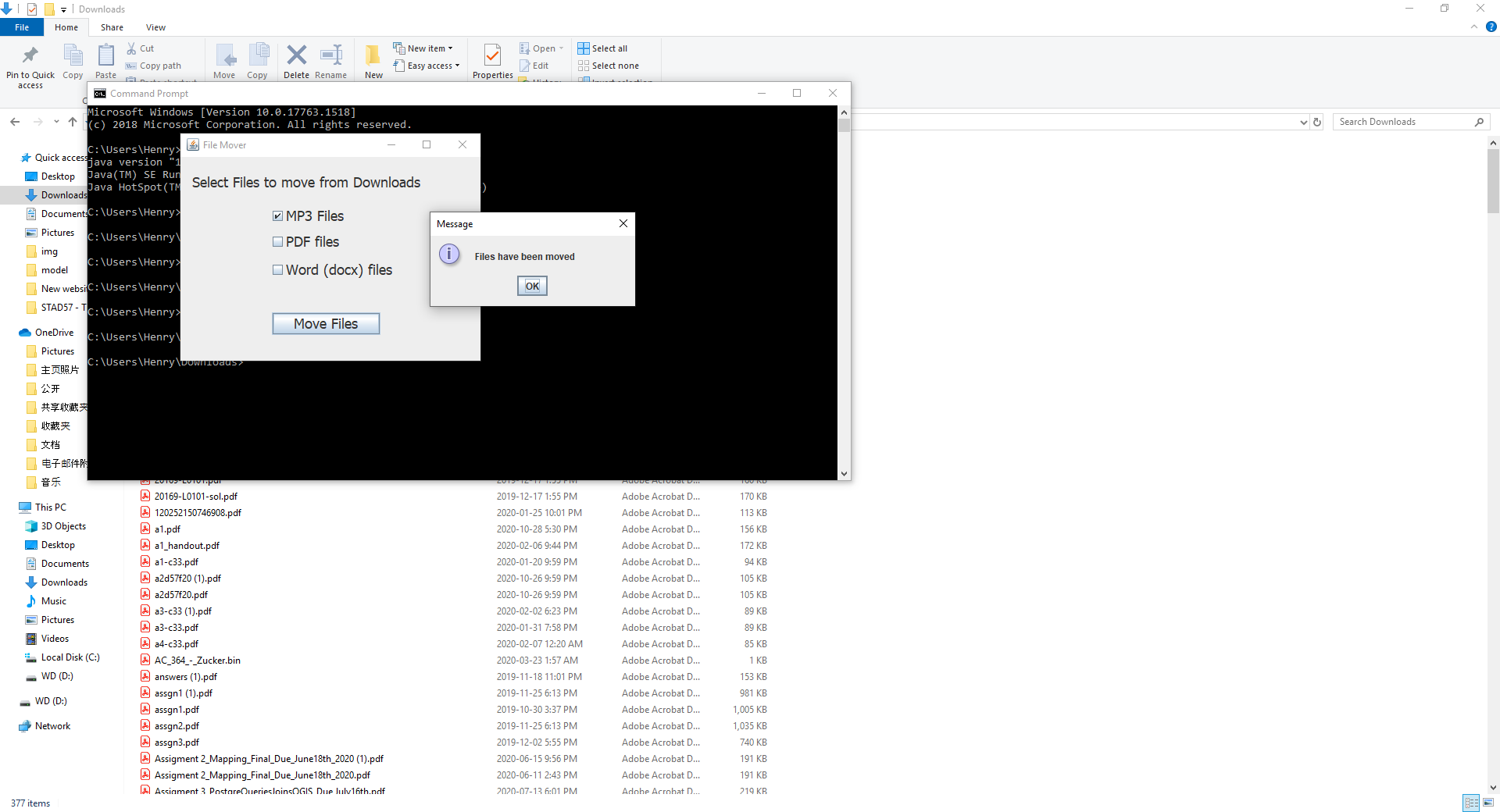 Motivation:That application began as a friend complaining to me of having to constantly move downloaded mp3 files from the downloads folder to the desktop. So I decided to create a Java program that would scan the downloads folder for mp3 files. Then move those files to the desktop. I gave that version of the program to my friend and she was very satisfied with the result. Afterwards by popular demand from friends and for personal use, I added in the capability to move PDF and Microsoft word documents and to also decided to make it a background process instead, so everytime the user downloaded a new file, it would check if the file is Mp3, pdf or a word document and move it to desktop.