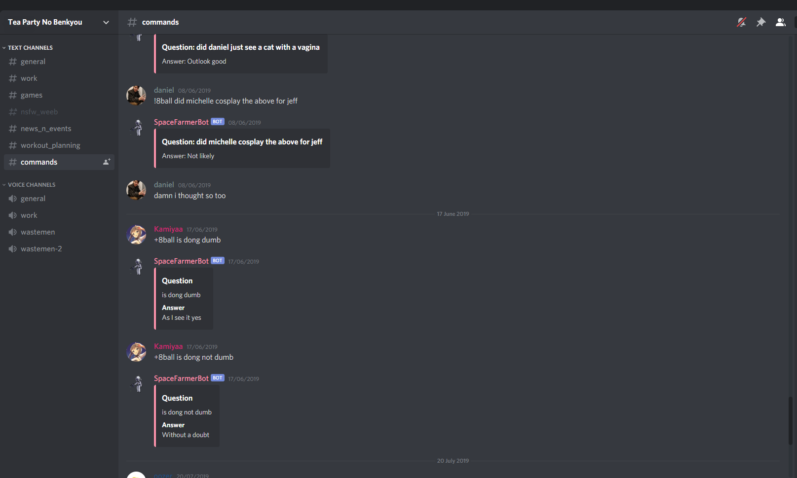 a customized bot for our servers and decided to use this bot as a catalyst for learning Golang. We added support for serving images from image boards, reverse image searching images that